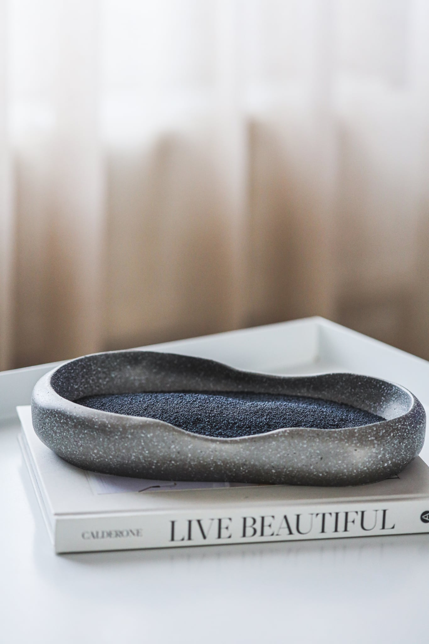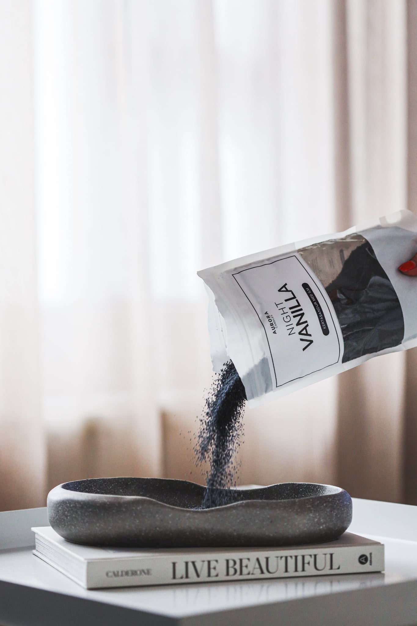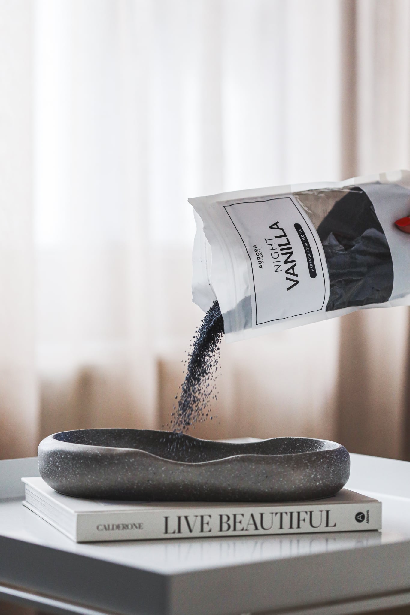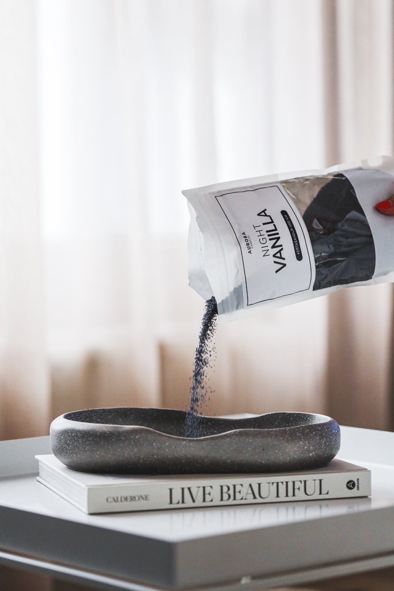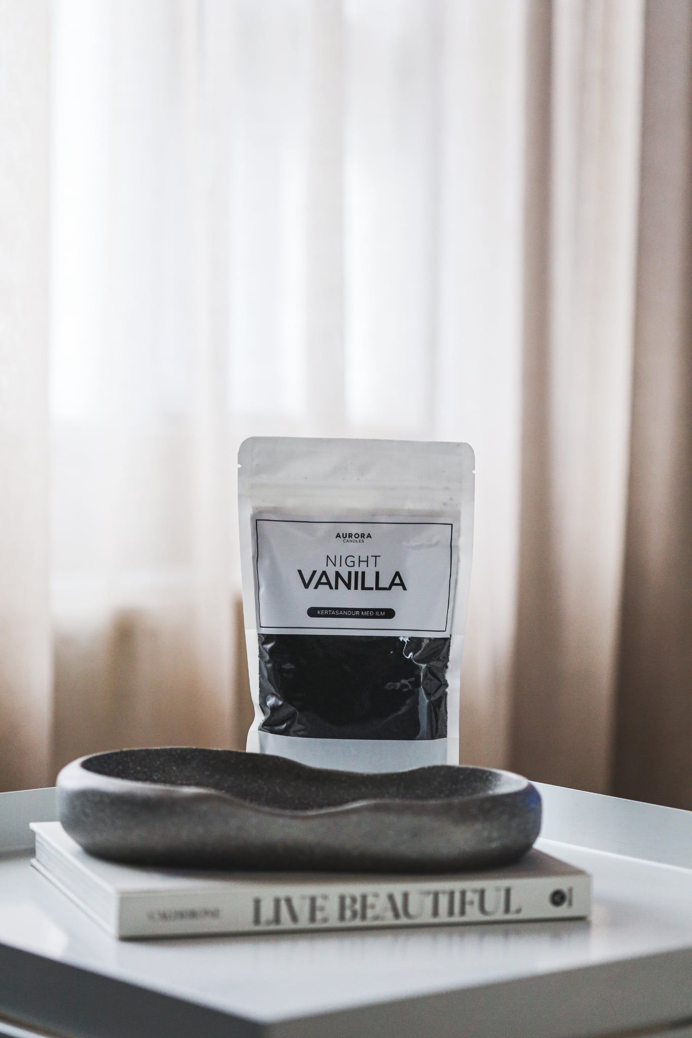 Night Vanilla Kertasandur - hannaður af HN Gallery & Novi Bakki - fágaður bakki með fallegum línum & steináferð.
