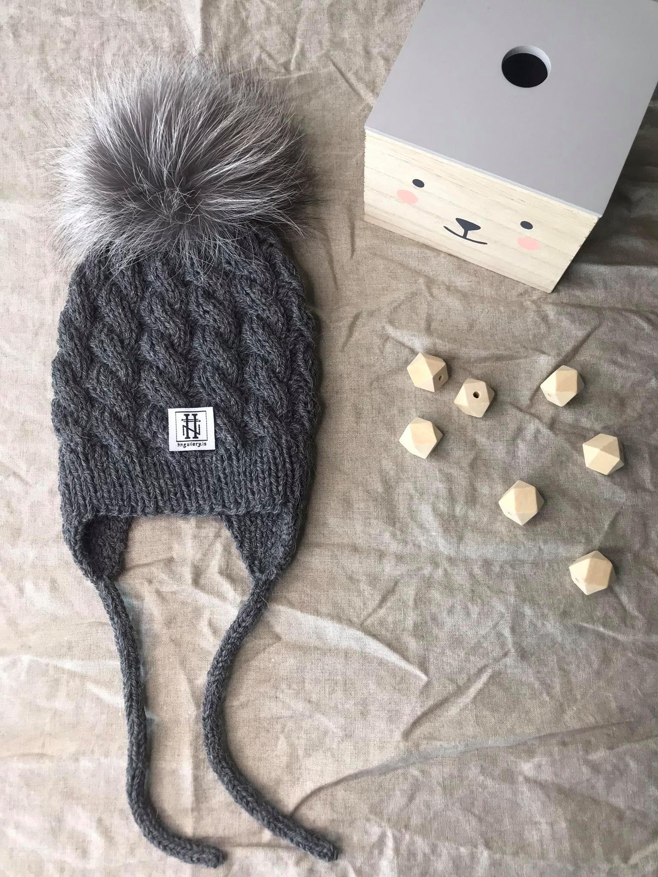 Vönduð handprjónuð kaðlahúfa úr mjúkri alpakka ull og silki mohair þræði. Húfan er hlý, mjúk og heldur sér vel. Hún er með ekta dúsk sem hægt er að smella af og þá er hægt að þvo húfuna á ullarþvotti í þvottavél.