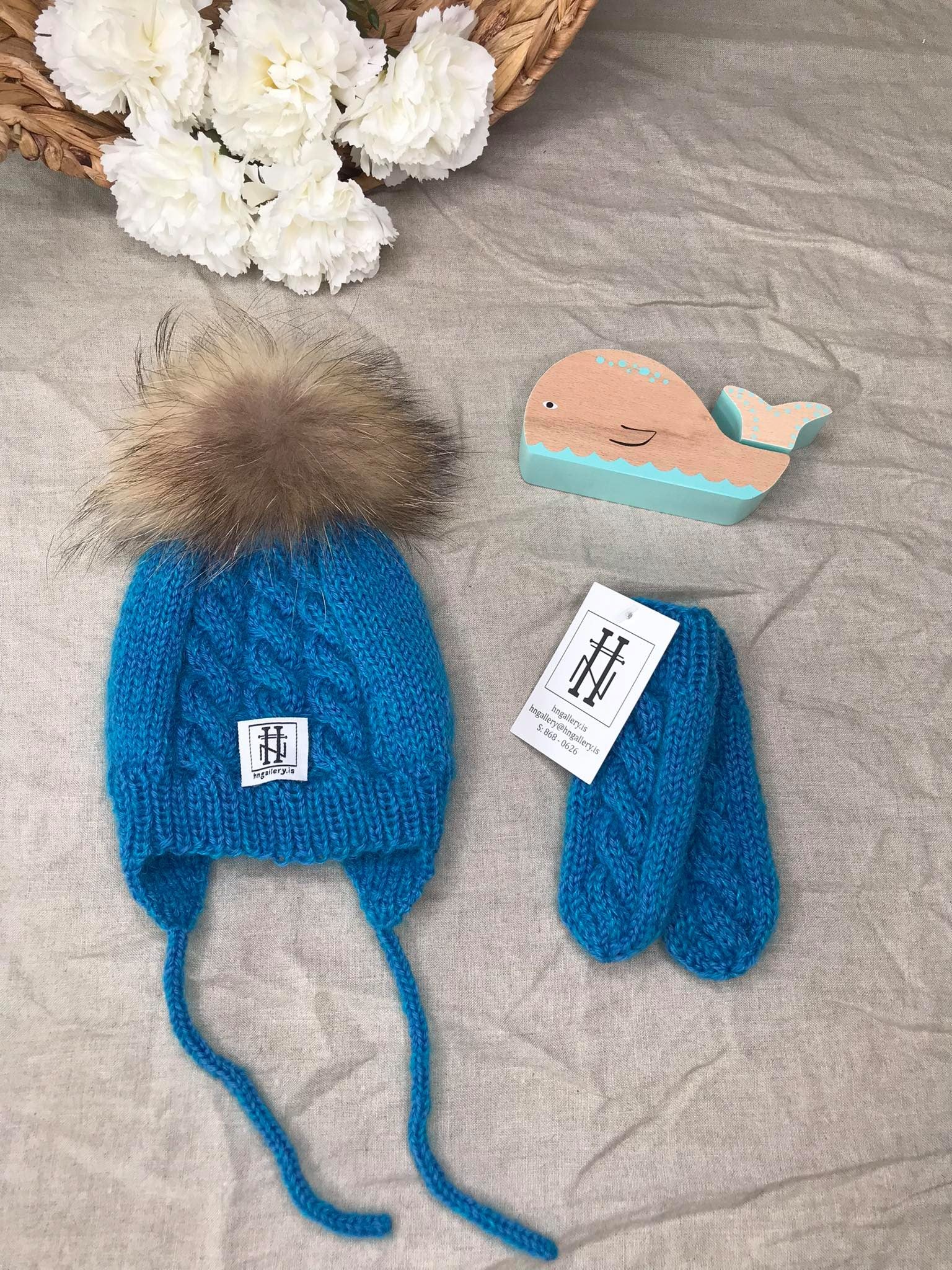 Yndislega mjúkt og gott ungbarnagjafasett sem samanstendur af húfu og vettlingum. Settið er handprjónað úr merino ull og mohair þræði. Snið húfunnar er einstaklega gott, svo hún situr vel á höfði barnsins og vettlingarnir eru uppháir svo þeir detta ekki auðveldlega af litlum höndum.