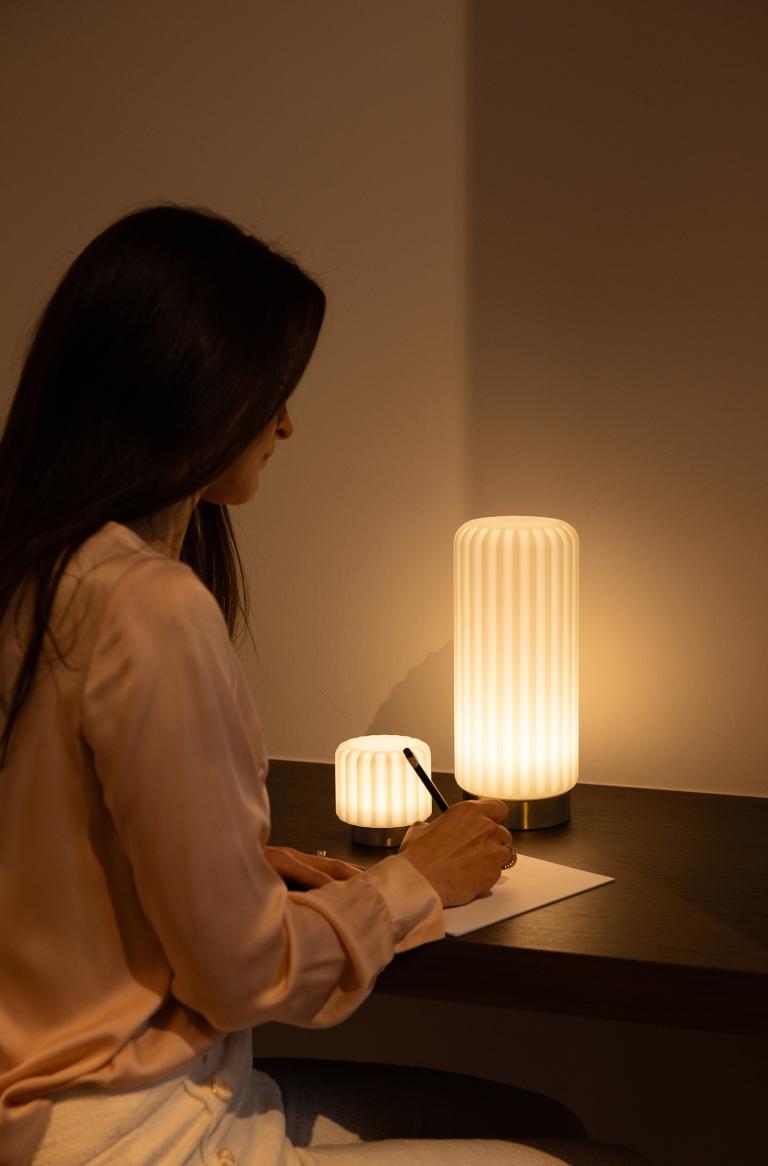 Bættu við hlýju og notalegri stemningu með tímalausri og nútímalegri hönnun frá Atelier Pierre. Dentelles lampinn er með stillanlegum ljósstyrk svo þú getur auðveldlega lagað birtuna að aðstæðum – hvort sem þú vilt milda lýsingu fyrir kvöldstund eða bjartari birtu til lesturs. Ýttu og haltu inni takkanum til að stilla ljósið.