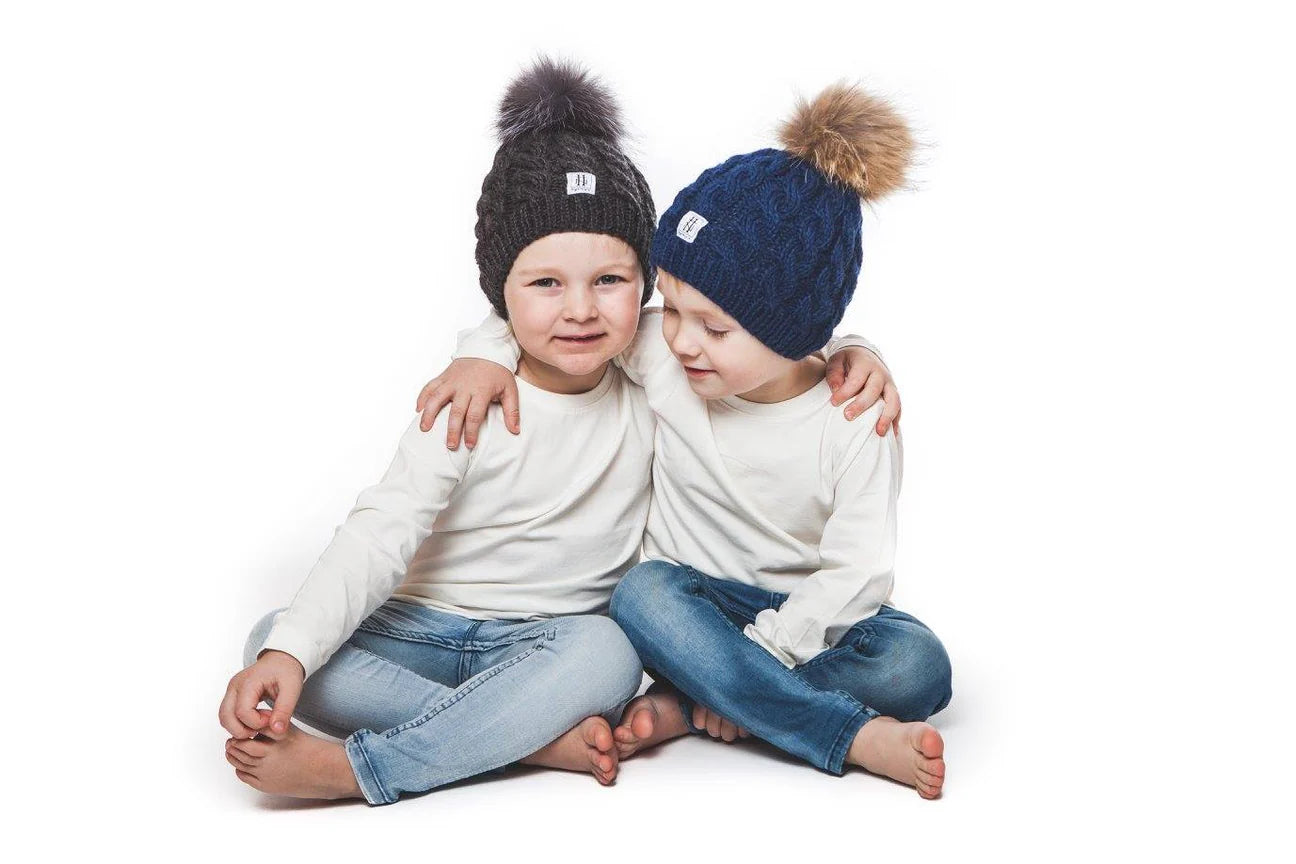 Vönduð handprjónuð kaðlahúfa úr mjúkri merino ull og mohair þræði. Húfan er hlý, mjúk og heldur sér vel. Hún er með ekta dúsk sem hægt er að smella af og þá er hægt að þvo húfuna á ullarþvotti í þvottavél.