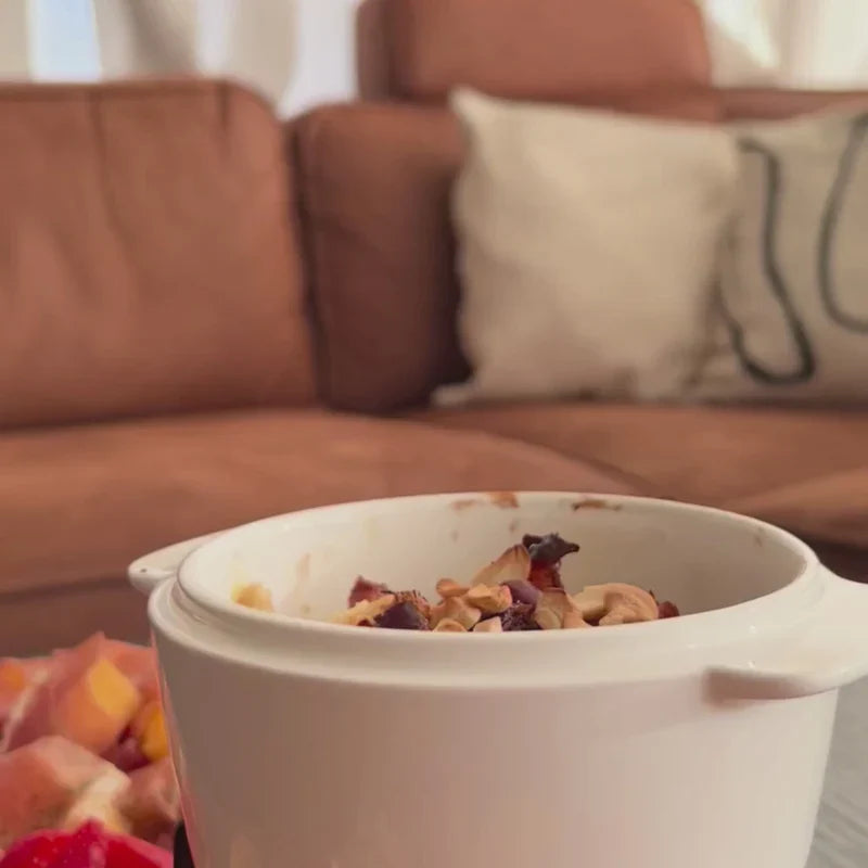 Pottinn skal hita fyrst í ofni en kertið viðheldur síðan hita á meðan notið er.