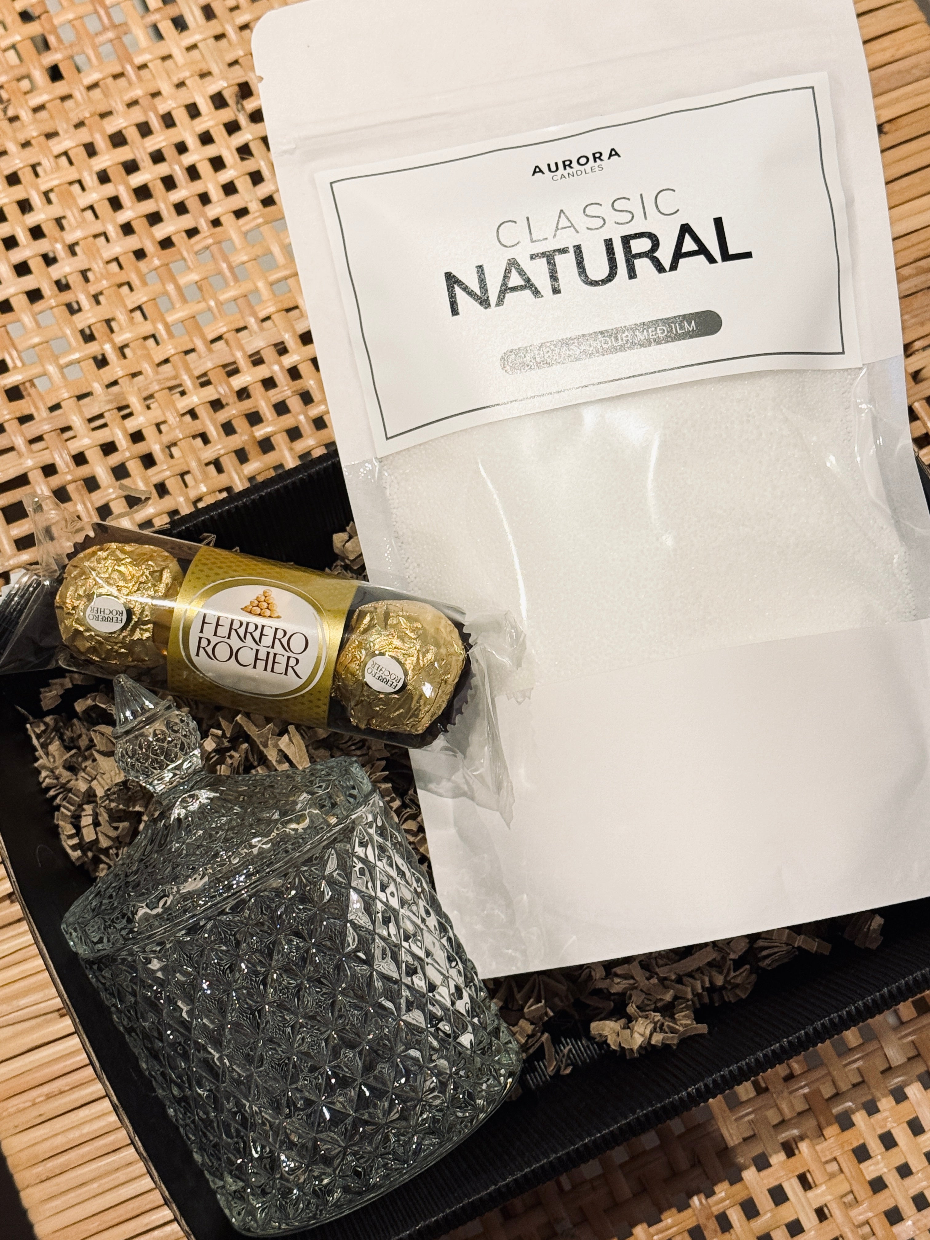 Tilvalin glerkrukka til þess að gera kerti úr með Aurora kertasandinum okkar.