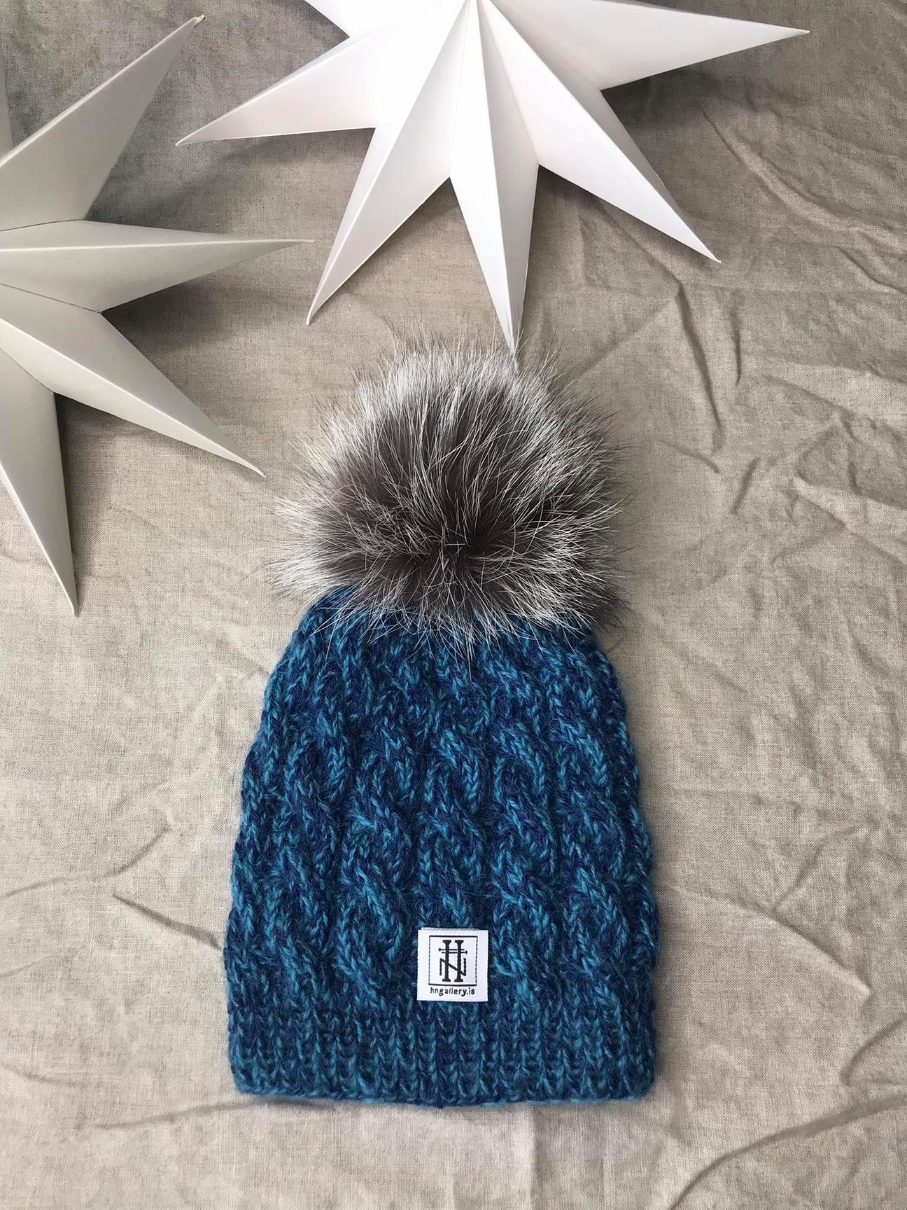 Vönduð handprjónuð kaðlahúfa úr mjúkri merino ull og mohair þræði. Húfan er hlý, mjúk og heldur sér vel. Hún er með ekta dúsk sem hægt er að smella af og þá er hægt að þvo húfuna á ullarþvotti í þvottavél.