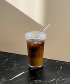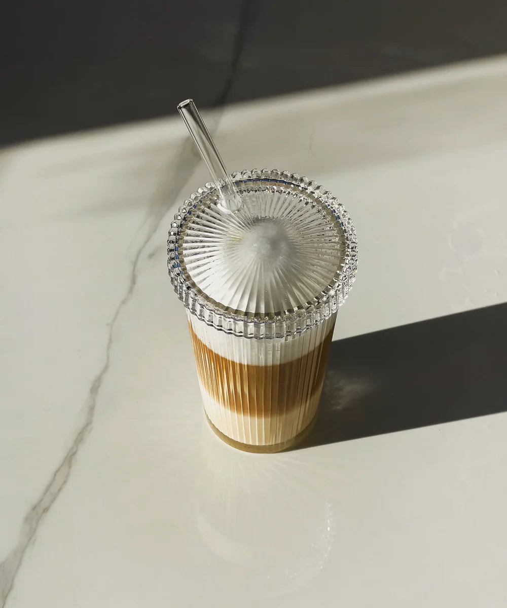 Rifflað glerglas með loki og glerröri – fullkomið fyrir ískaffi eða hressandi drykki!