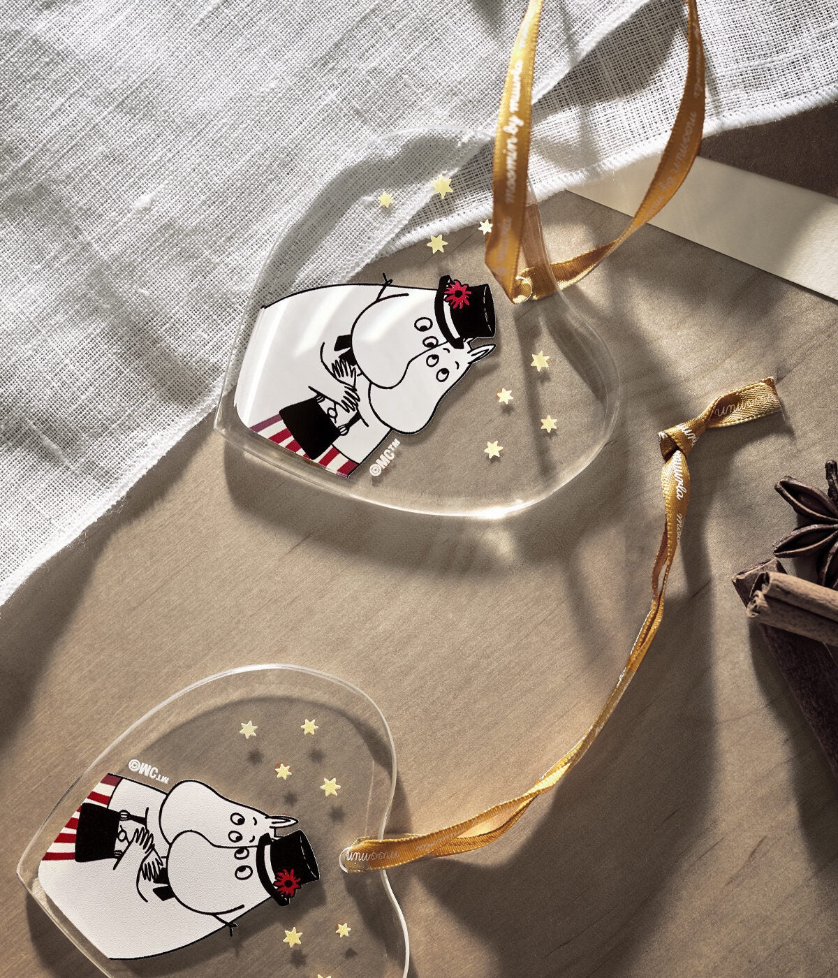 Bættu ævintýrum og hlýju við jólin með þessu dásamlega Moomin-skrauti. Handgert úr gleri og skreytt með mjúkum satínborða – fullkomið til að hengja á jólatréð eða nota sem skraut á gjafapakka til að gera gjöfina enn persónulegri.