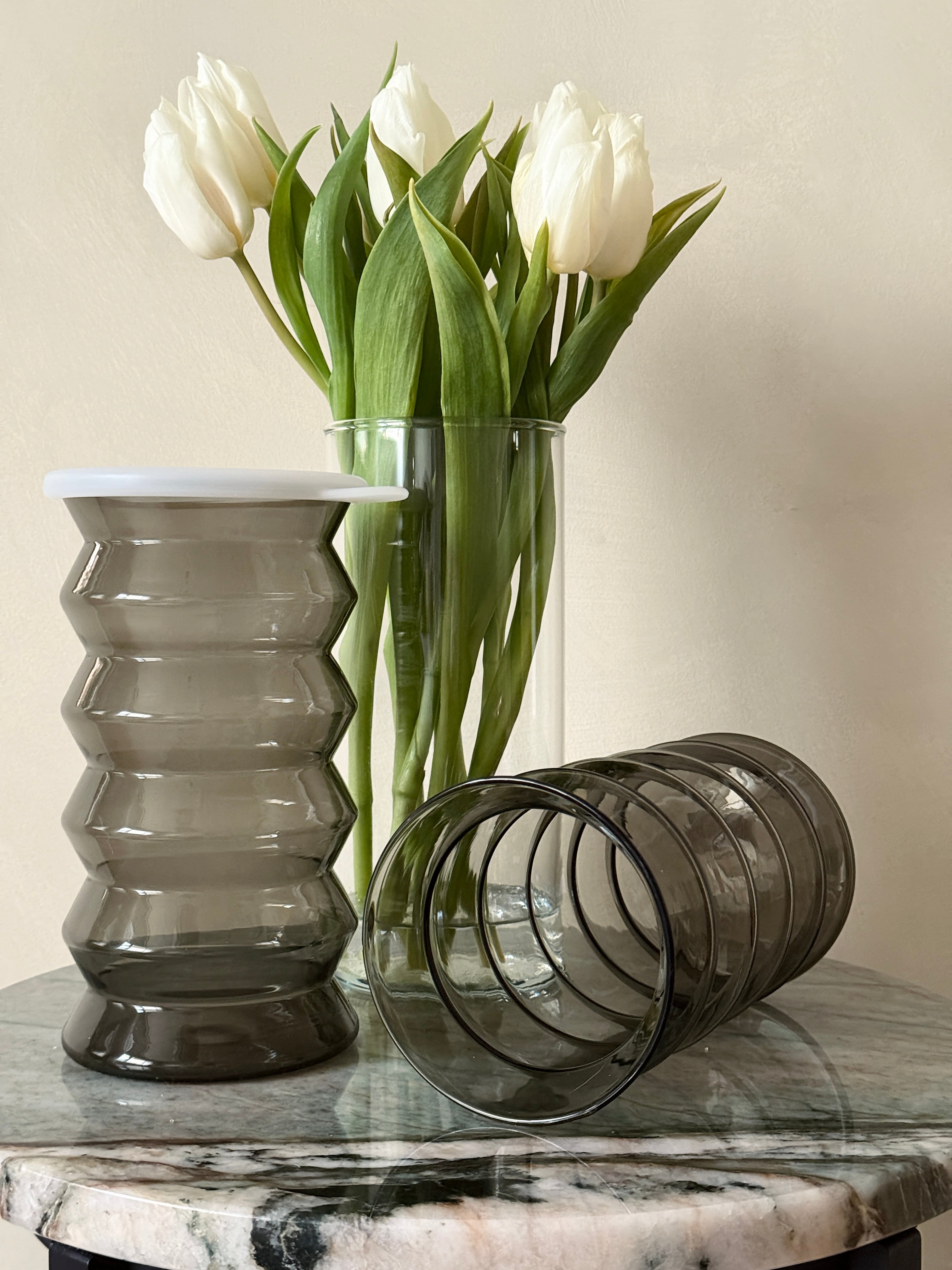 Með bylgjulaga formi og mildum gráum lit færir þessi vasi eða krukka rólega og stílhreina stemningu í rýmið. Hann hentar jafnt fyrir blóm, greinar eða sem falleg geymslulausn á borði eða hillu – hönnunarhlutur sem er bæði nytsamlegur og fallegur.
