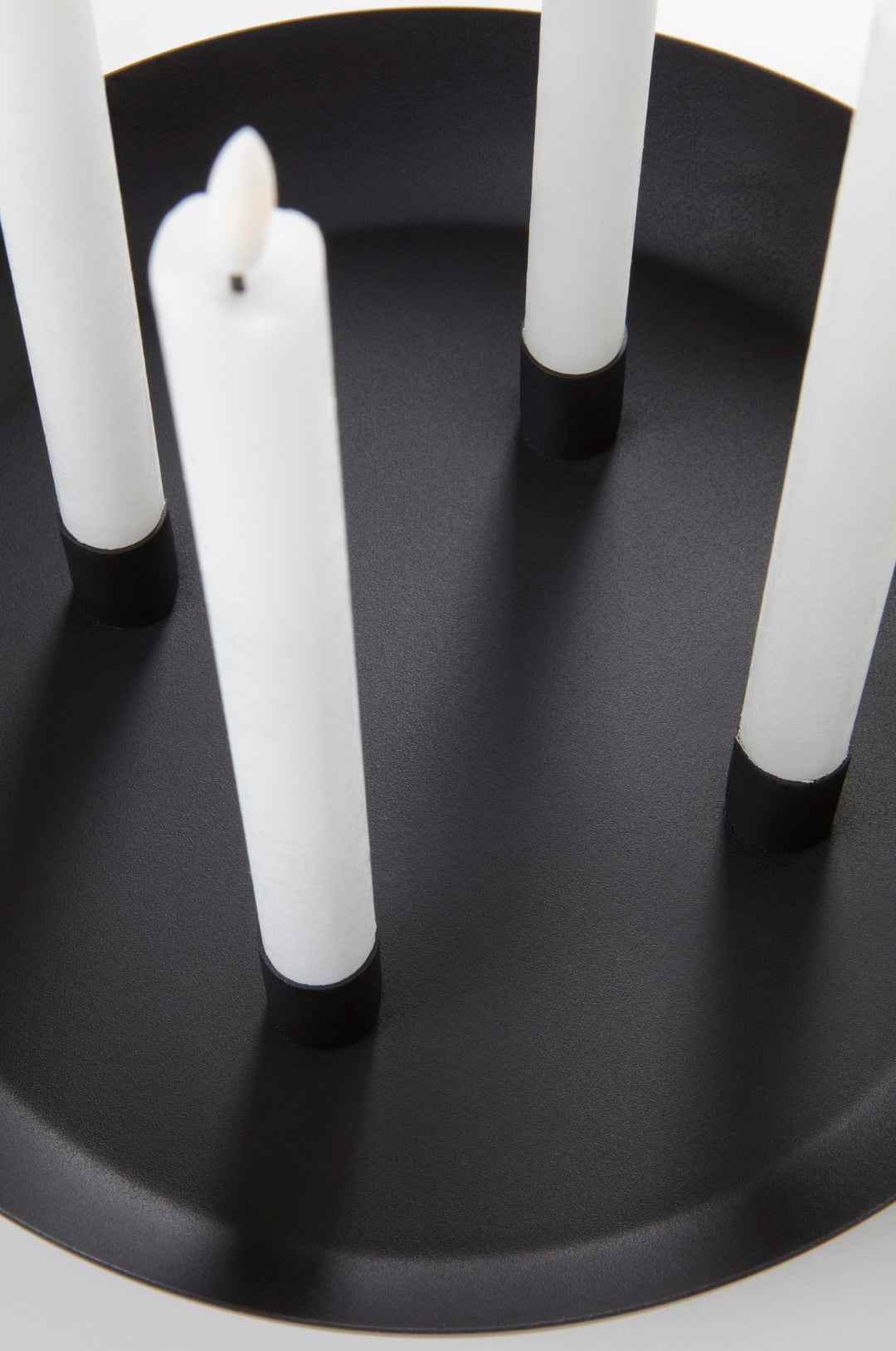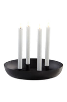 Járnkertastjaki með fjórum hólfum fyrir kerti. Hringlótt skál kertastjakans er hægt að skreyta fyrir ýmis tilefni en einnig er hún falleg ein og sér. Hægt er að nota hann sem aðventustjaka fyrir jólin og skreyta td með könglum, greni, mosa eða því sem þér dettur í hug. Kertastjakinn er með möttu yfirborði.