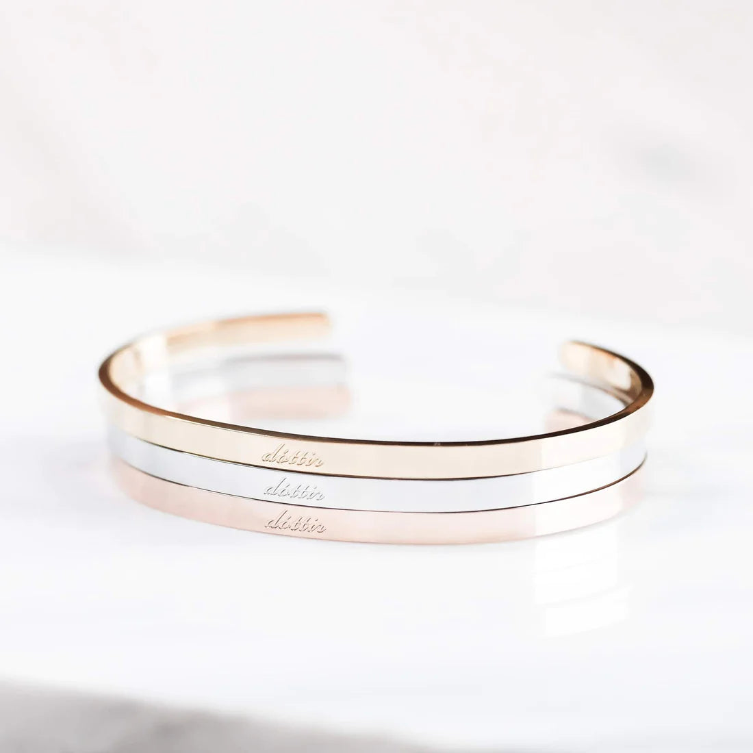 Stál armband með einfaldri en þýðingarmikilli áletrun. Að vera dóttir er eitthvað sem við konur eigum allar sameiginlegt hvort sem það kemur fram í eftirnafninu okkar eða ekki. Orðið “dóttir” hefur á síðari árum orðið tákn víða um heiminn fyrir konur sem standa með sjálfum sér og fara sínar eigin leiðir.