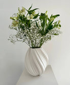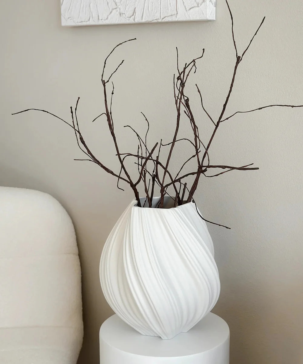 Vasinn er hannaður til að láta blómin njóta sín, en jafnframt til að vera sjálfur miðpunktur rýmisins. Sérlagað opið heldur stönglunum í fullkomnu jafnvægi og gerir hverja samsetningu nákvæmlega eins og hugmyndin kallar á.