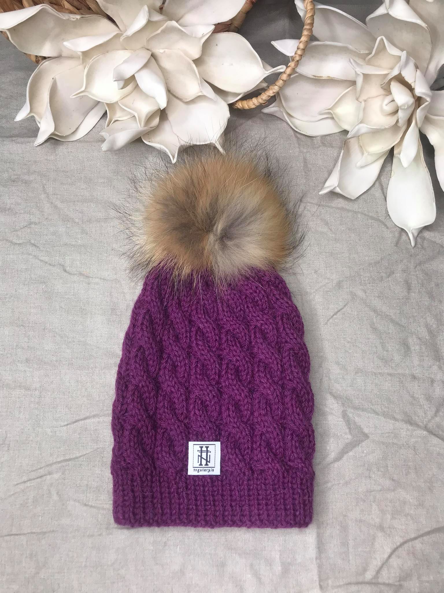 Vönduð handprjónuð kaðlahúfa úr mjúkri alpakka ull. Húfan er hlý, mjúk og heldur sér vel. Hún er með ekta dúsk sem hægt er að smella af og þá er hægt að þvo húfuna á ullarþvotti í þvottavél.